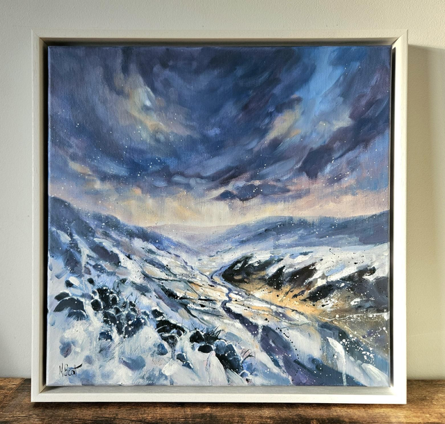 Original oil painting based on Upper Teesdale, County Durham, painted in 2025. This painting is in oil on stretched canvas measuring 16 x 16 inches. It is framed in a white wooden tray frame, but can be purchased unframed.