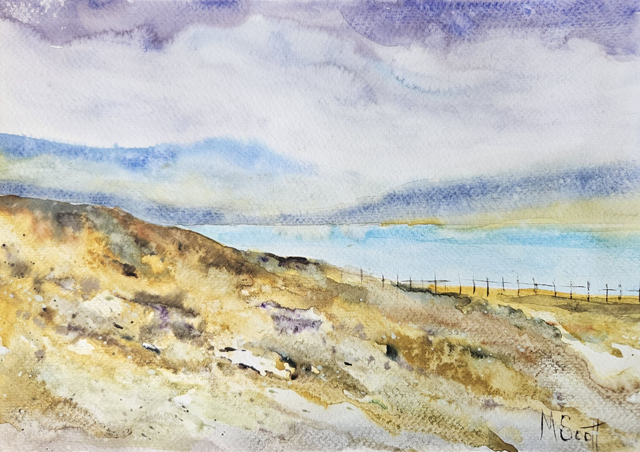 Original watercolour painting inspired by Cow Green reservoir in Teesdale, painted in 2025. The original painting is watercolour on 300gsm paper measuring 21 x 29.7cm (A4). It can be purchased either on it's own without mount or frame, with a mount only or mounted and framed in a white wood effect frame.